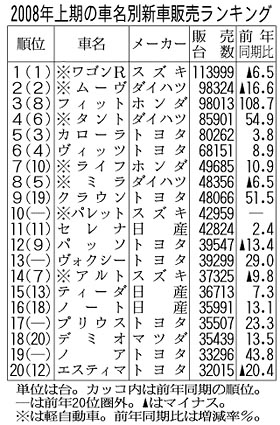 日本自動車販売協会連合会と全国軽自動車協会連合会が4日発表した2008年上期(1〜6月)の新車販売台数ランキングによると、スズキの軽自動車「ワゴンR」が、上期として5年連続で首位を守った。