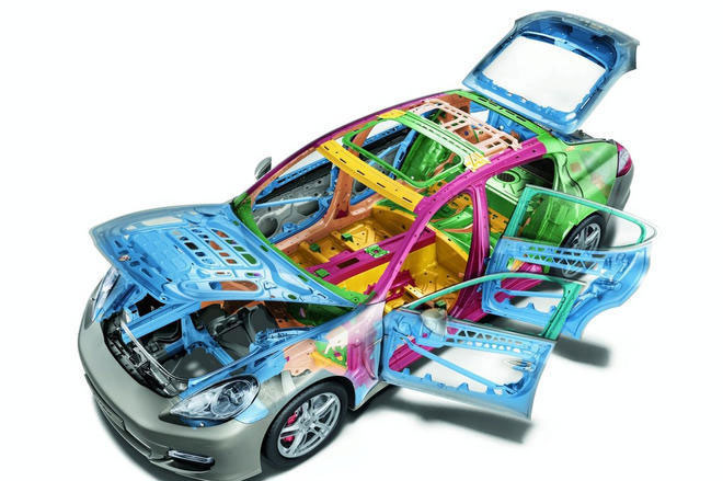 ボディの素材にはアルミやマグネシウムが投入され、車重はパナメーラSで1800kg。空力特性を引き上げるため、ボディ下回りのフラット化も図られた。パナメーラターボには格納式のリアスポイラーを装備。走行状況に応じて4段階に高さや角度が可変する。